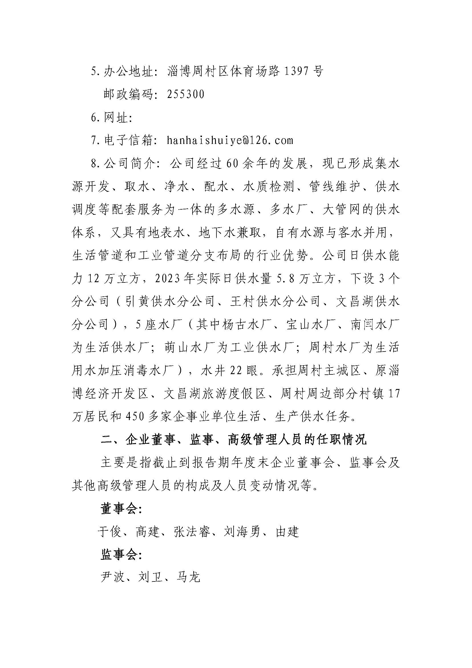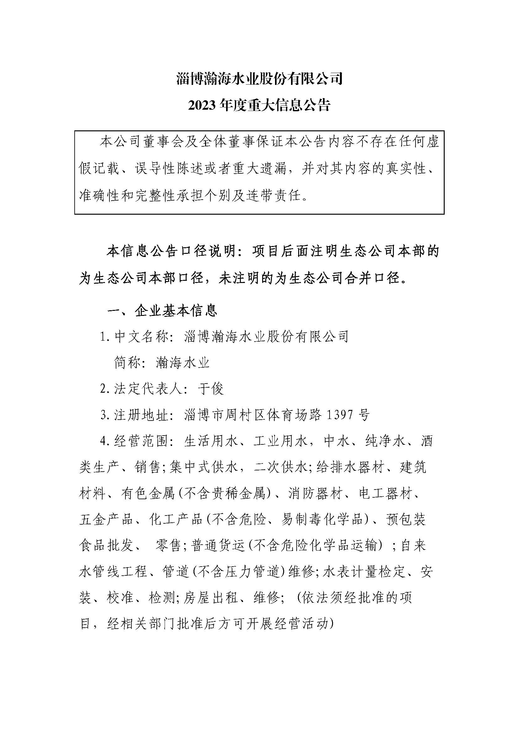 淄博瀚海水业股份有限公司2023年度重大信息公告